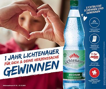 Seit 2009 sind wir stolzer Partner von SOS-Kinderdorf e.V. und unterstützen mit unserer 'Lichtblicke schenken' Aktion Kinderdorf-Projekte in Ostdeutschland. In 15 Jahren konnten wir über 335.000 Euro für 40 Projekte bereitstellen. Dieses Jahr helfen wir, das Kinderdorfzentrum Leipzig mit Spiel-Elementen und Spielflächen zu unterstützen. Jeder Kauf unserer Aktionskästen mit Lichtenauer Mineralwasser von Oktober bis Dezember fließt mit 12 Cent in diese wichtige Aktion. Lasst uns gemeinsam Gutes tun! ?
