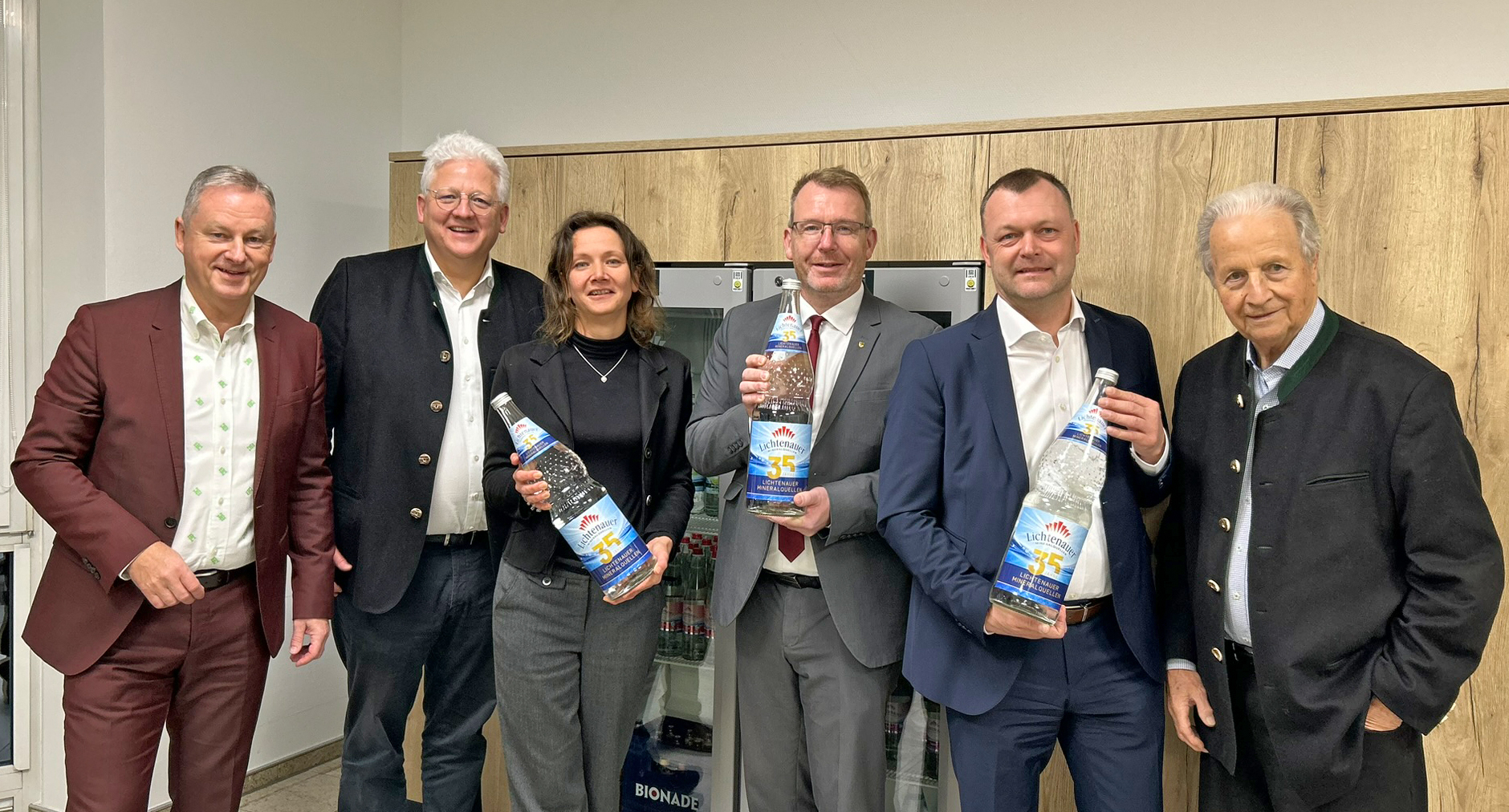 Im Rahmen einer kleinen Feierstunde mit fachlichem Austausch überreichten die Inhaber eine Sonderedition einer befüllten 3-Liter-Perlenflasche mit Jubiläumsetikett sowie die Lichtenauer Chronik, die die Entwicklung des Unternehmens dokumentiert. In einem anschließenden politischen Diskurs erhielt der Landrat Einblicke in die Herausforderungen der Mineralwasserbranche und in die aktuelle wirtschaftliche Situation des regionalen Brunnenunternehmens.