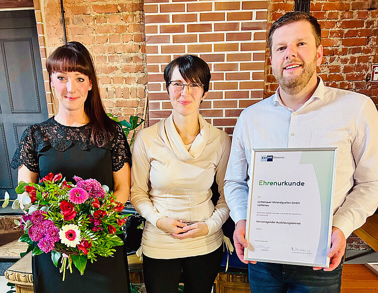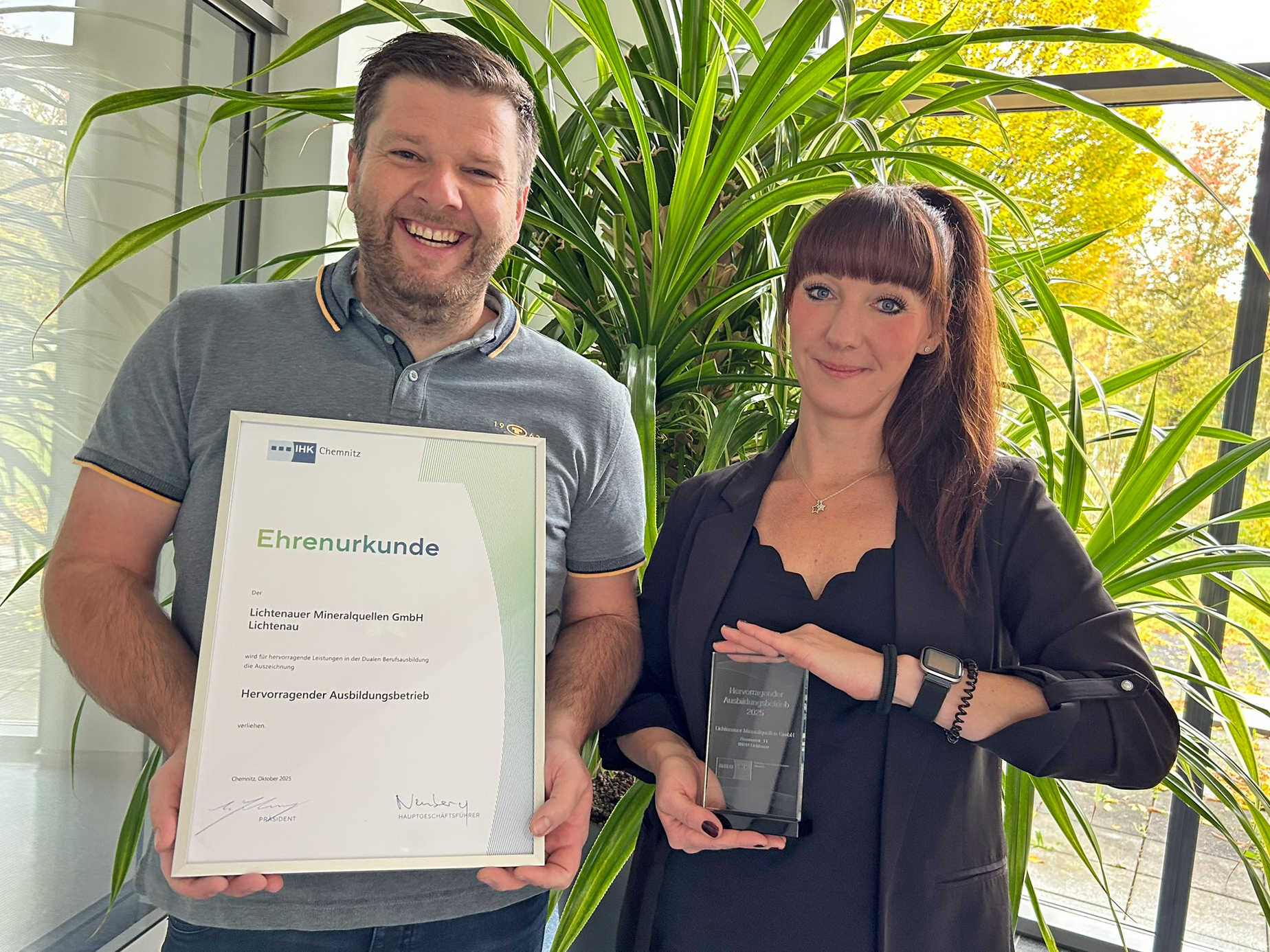 Lichtenau, 30. Oktober 2025 – Die Lichtenauer Mineralquellen GmbH wurde am 23. Oktober 2025 von der Industrie- und Handelskammer Chemnitz erneut mit dem Titel „Hervorragender Ausbildungsbetrieb“ geehrt. Im Rahmen einer feierlichen Übergabe nahmen Betriebsleiterin Sabine Wypior-Beckert sowie die Ausbildungsleiter Yvonne Jäpel und Falko Ludwig die Auszeichnung offiziell entgegen.