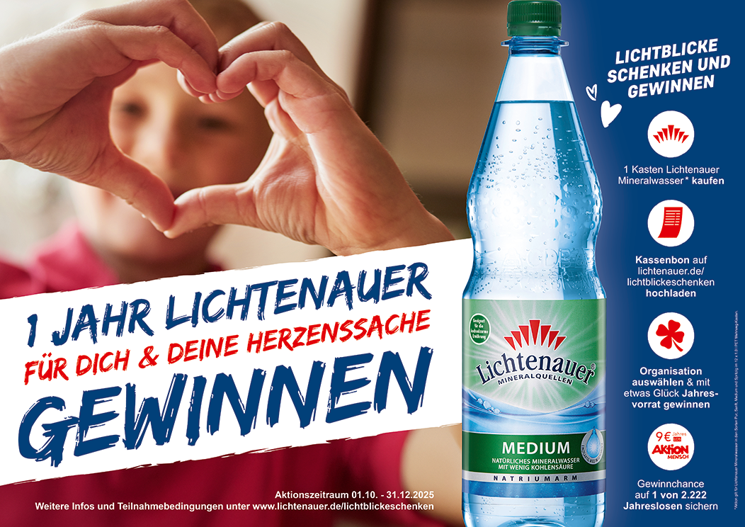 Lichtenau, 16. Oktober 2025 – In diesem Herbst startet die sächsische Mineralwassermarke Lichtenauer ihre neue Sozialaktion und bindet ihre Konsumentinnen und Konsumenten erstmals aktiv mit ein: Bei der Aktion „Für dich & deine Herzenssache“ kaufen die Teilnehmenden Lichtenauer Mineralwasser im 12 x 1,0 Liter PET-Mehrweg-Kasten und entscheiden per Kassenbon-Upload auf www.lichtenauer.de/lichtblickeschenken, welche soziale Organisation im Gewinnfall unterstützt wird.