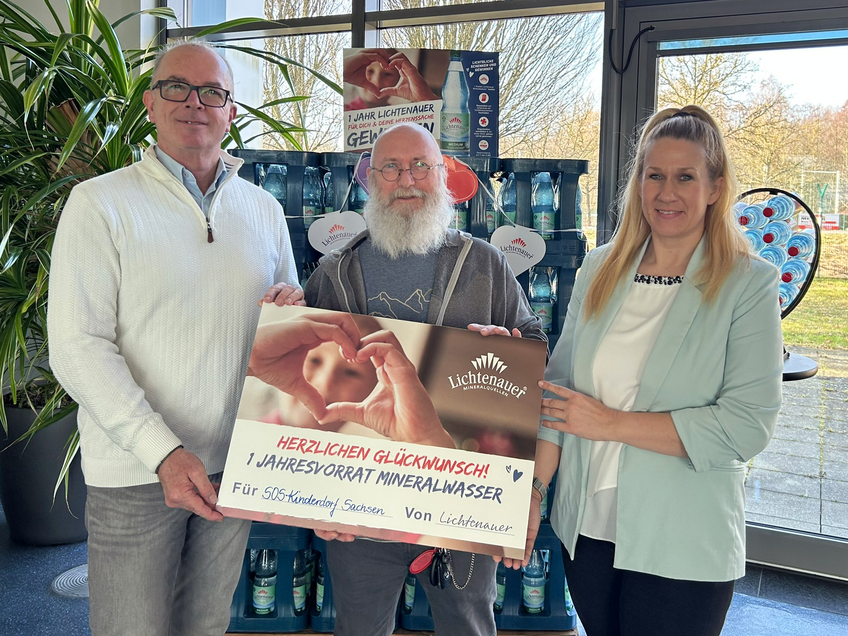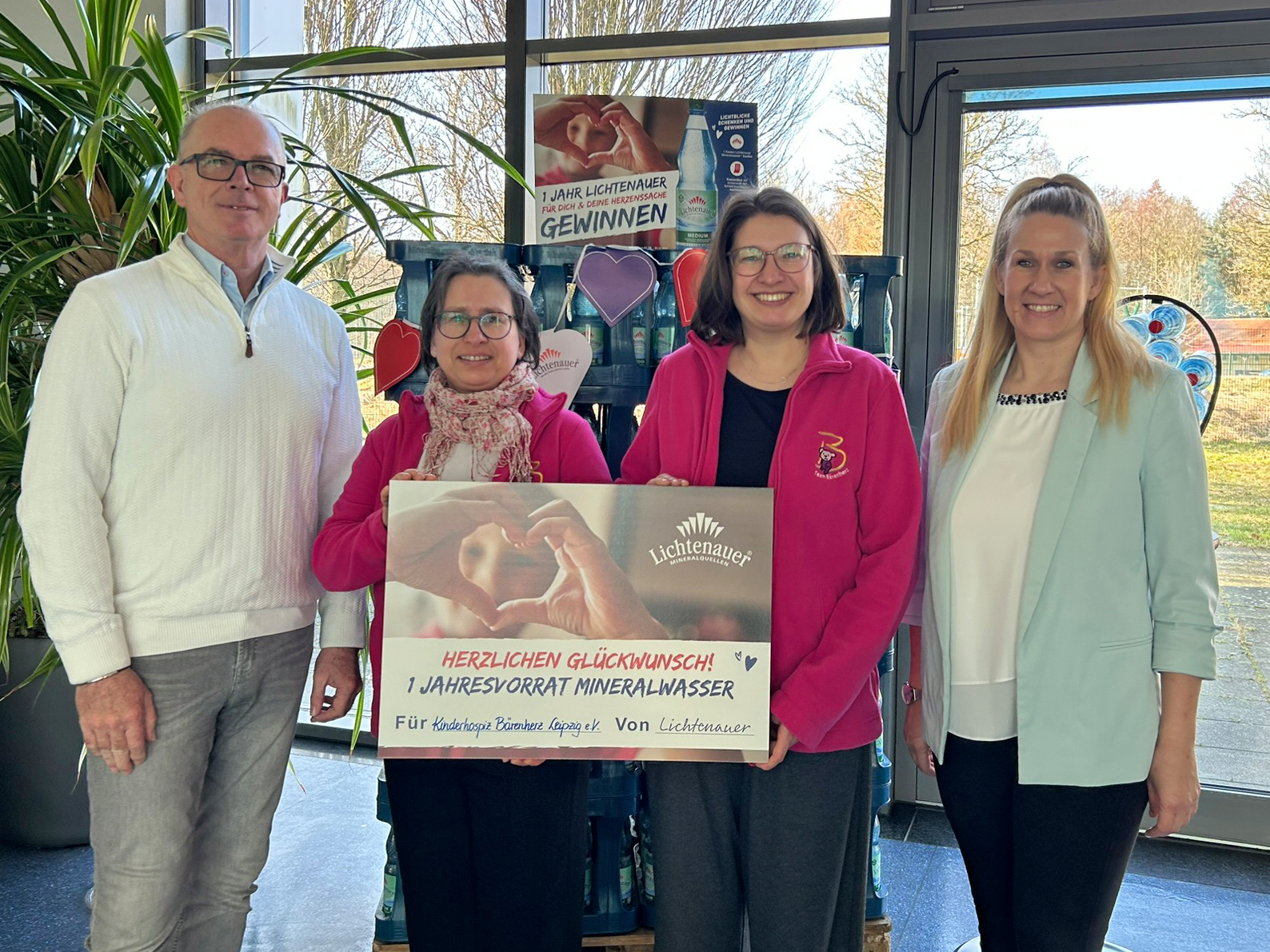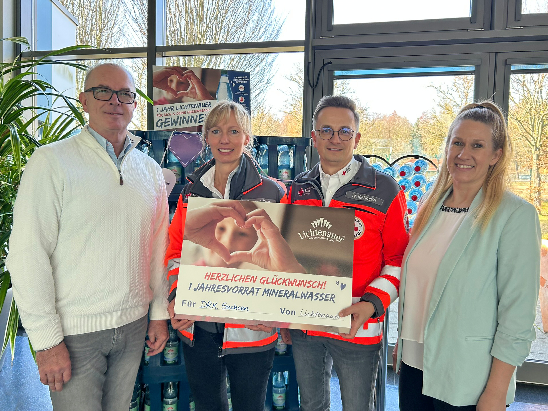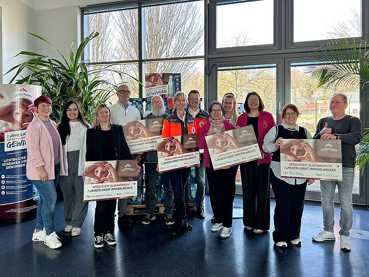 Lichtenau, 27. Februar 2026 – Vier wohltätige Organisationen aus Sachsen konnten heute einen symbolischen Scheck über einen Jahresvorrat Lichtenauer Mineralwasser in Empfang nehmen. Im Rahmen der Sozialaktion „Für dich & deine Herzenssache“ hatte die Marke Lichtenauer ihre Kunden im vergangenen Herbst aufgerufen, für ihre sächsische Lieblingsorganisation abzustimmen. Die Wahl der Teilnehmenden fiel auf das SOS-Kinderdorf Sachsen, den AWO Landesverband Sachsen e. V., das Deutsche Rote Kreuz in Sachsen und das Kinderhospiz Bärenherz Leipzig e. V. Deren Vertreterinnen und Vertreter kamen heute am Unternehmensstandort in Lichtenau zur feierlichen Abschlussveranstaltung mit Betriebsführung zusammen.