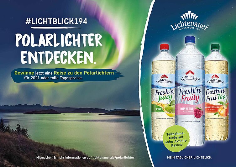 Die Sonne lacht, die Temperaturen steigen und die Urlaubszeit steht bevor. Doch dieser Sommer wird anders als die vergangenen. Abstandsregeln, Mundschutz, Kontaktbeschränkungen und weniger bis gar keine Urlaubsreisen. Gerade in diesem Jahr fallen die langersehnten Urlaube bei den Meisten anders aus als ursprünglich geplant. Lichtenauer schafft in dieser Zeit den notwendigen Lichtblick und verlost neben hochwertigen Tagespreisen eine Reise für zwei Personen zu den Polarlichtern. Die Glückscodes befinden sich auf Lichtenauer Fresh'n-Getränken mit dem Aktionsetikett "Polarlichter entdecken".